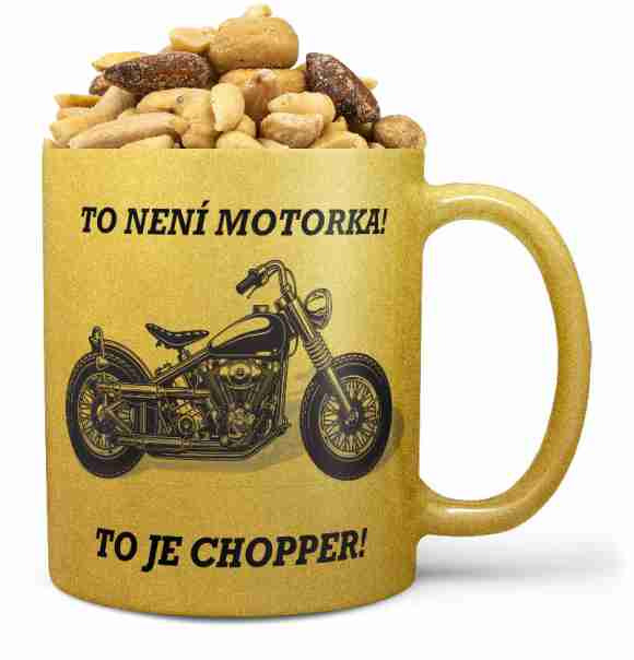 Hrnek To je Chopper - zlatý (Náplň hrníčku: Směs slaných oříšků)