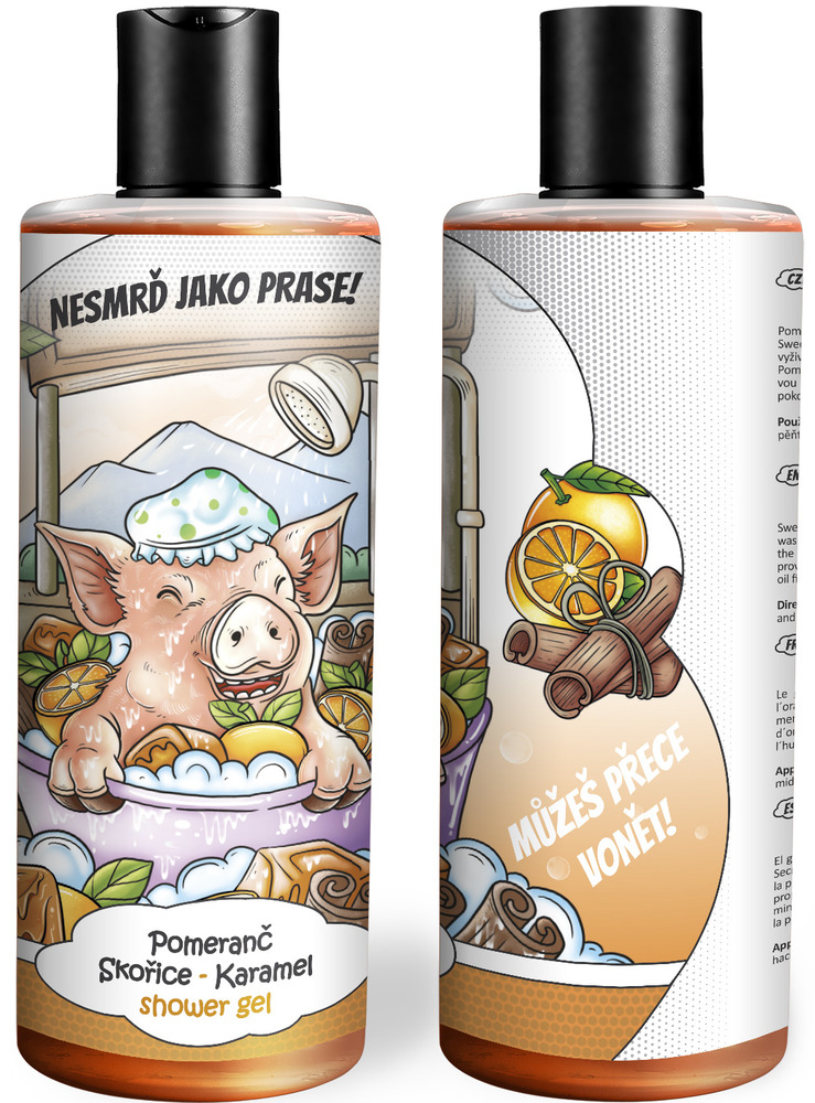Vtipný sprchový gel – Jako prase (Vůně sprchového gelu: Pomeranč, skořice & karamel)